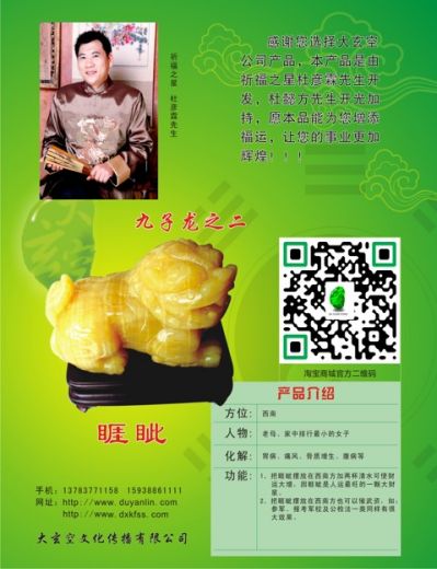 睚眥,是老二,平生好斗喜殺,刀環(huán)、刀柄、龍吞口便是它的遺像。這些武器裝飾了龍的形象后,更增添了懾人的力量。它不僅裝飾在沙場(chǎng)名將的兵器上,更大量地用在儀仗和宮殿守衛(wèi)者武器上,從而更顯得威嚴(yán)莊重。在大玄空風(fēng)水上是可以催武貴、催偏財(cái),運(yùn)用布局可顯神奇效果。